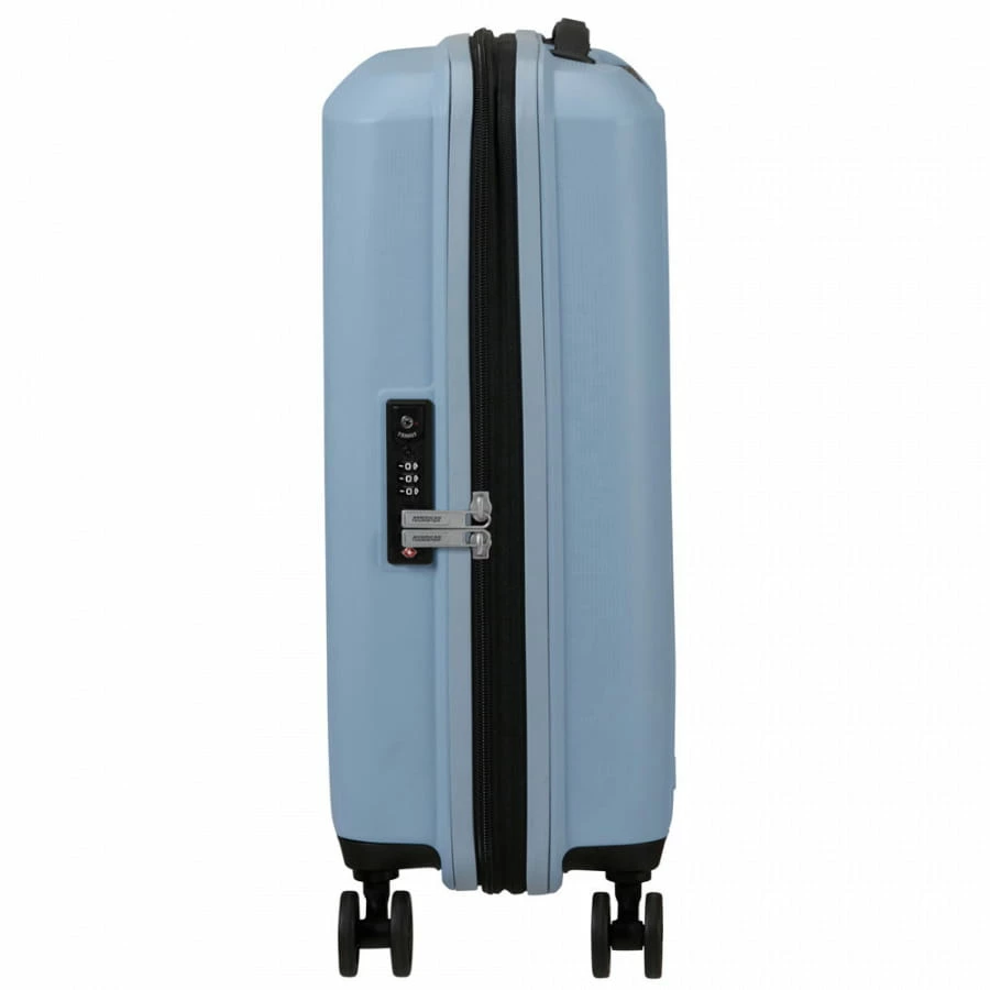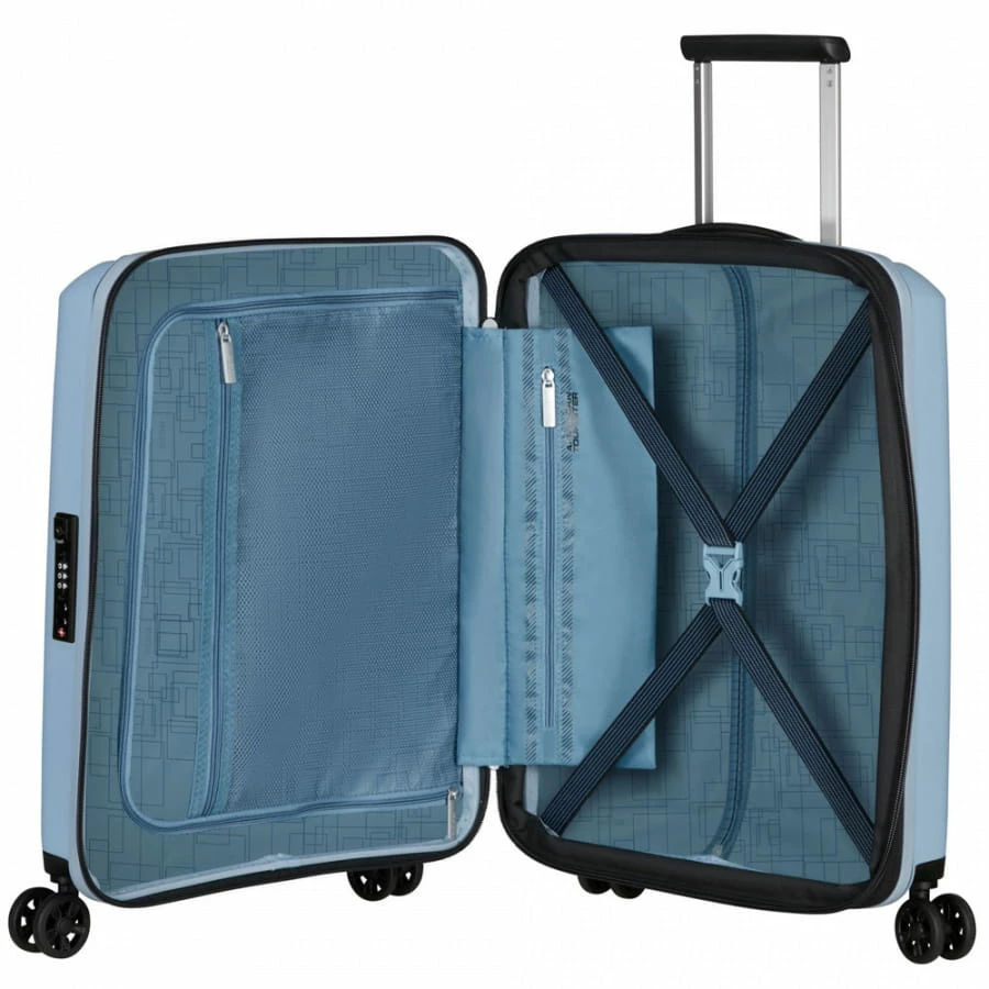 Mit dem American Tourister Aerostep Trolley lässt es sich – sowohl privat als auch geschäftlich – sehr komfortabel Verreisen. Dafür sorgen die vier 360-Grad Doppelrollen, die mehrfach arretierbare Trolleystange und die Handgriffe. Der Korpus des Koffers besteht aus hochwertigem Polypropylen, ist als nicht nur besonders stabil, sondern auch leicht und langlebig. Geöffnet wird der Reisekoffer mithilfe des umlaufenden Reißverschlusses, welcher zusätzlich durch ein TSA-Zahlenschloss gesichert ist. Im Inneren befindet sich das große Hauptfach, ein abgetrenntes Wäschefach, Packriemen, ein Netzfach und eine Schürzentasche. Dank der Reißverschluss-Dehnfalte kann das Volumen des American Tourister Aerostep Trolley bei Bedarf zusätzlich erweitert werden.