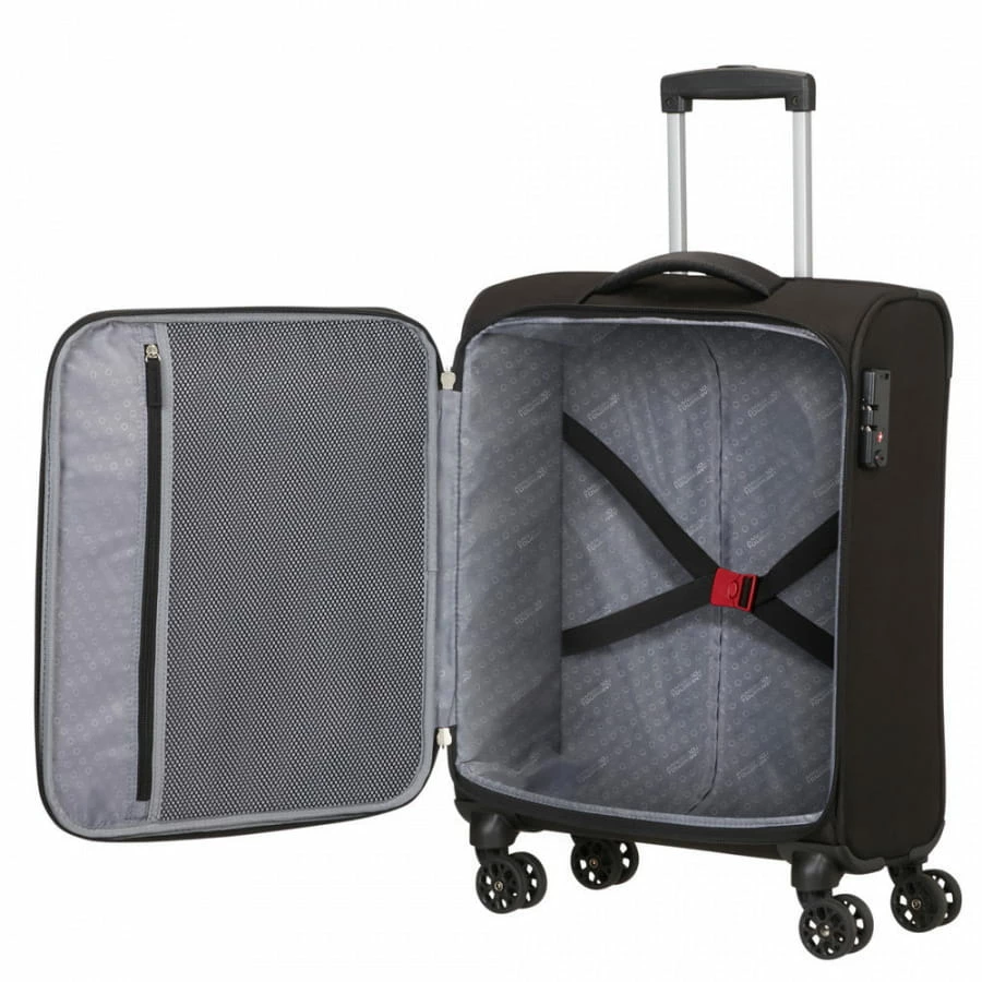 Der American Tourister Sky Surfer Trolley kann dank seines schlichten Designs sowohl für den Urlaubs oder die Geschäftsreise verwendet werden. Die mitgeführten Utensilien finden in den Reißverschluss-Vortaschen, im großen Hauptfach mit integrierten Packriemen und den Innenfächern Platz. Das Innenfach kann zudem mit dem im Korpus integrierten TSA-Zahlenschloss (3-stellige Kombination frei wählbar) sicher verschlossen werden. Transportiert wird der Koffer mithilfe der Handgriffe, der mehrfach arretierbaren Trolleystange und der vier 360-Grad Doppelrollen. Dank des verarbeiteten Polyesters ist er zudem besonders leicht, wasserabweisend und strapazierfähig.