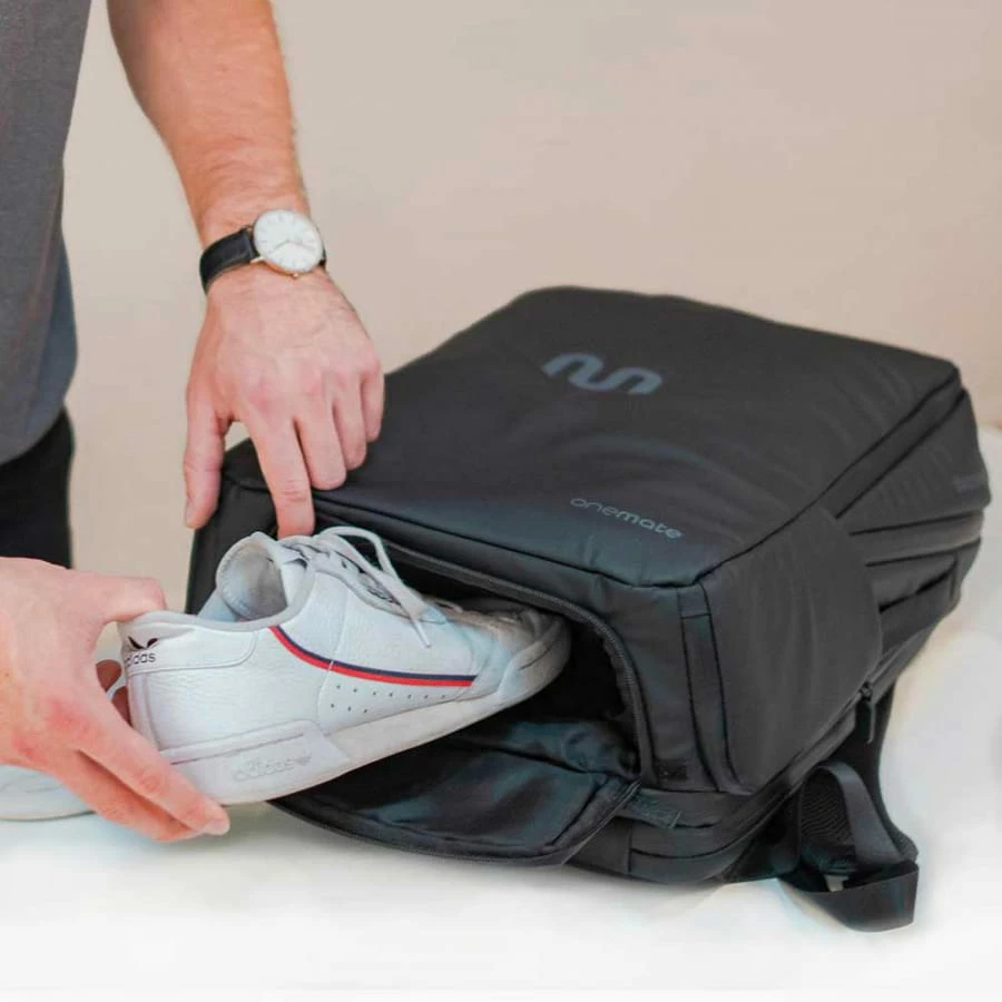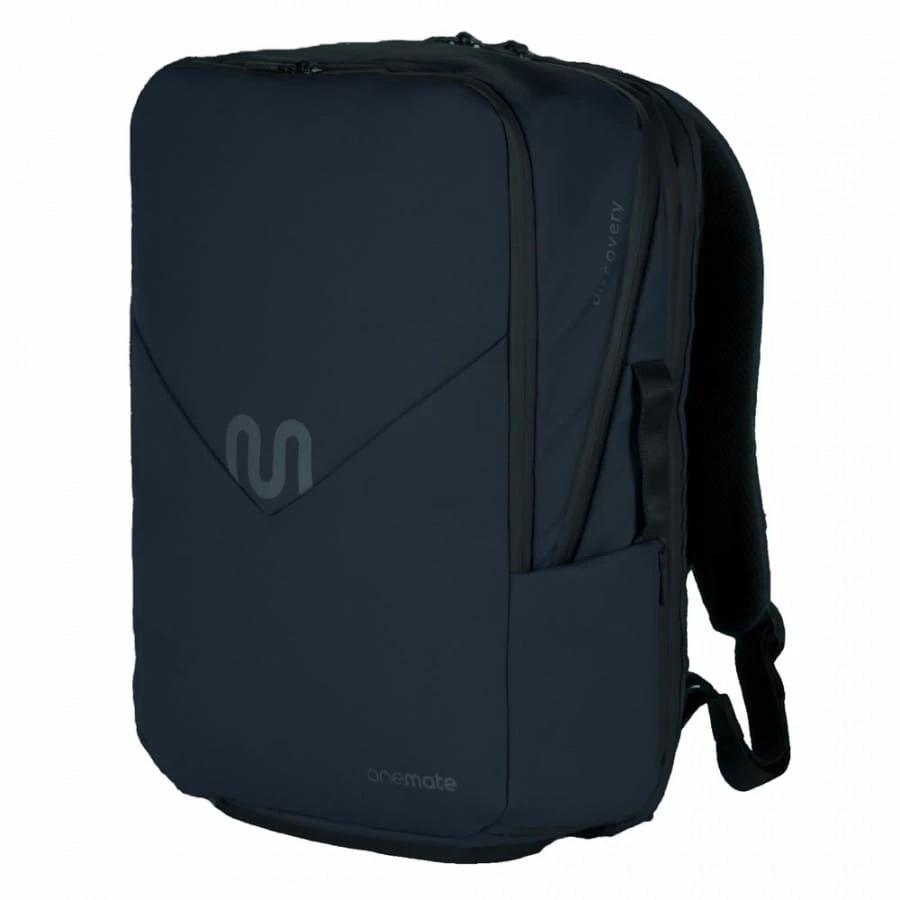 Anstatt eines Kabinentrolleys kann man auch Rucksäcke wie den Onemate Discovery als Handgepäck mit in das Flugzeug nehmen. Dieser ist dank des gepolsterten Rückens, der Stufenlos verstellbaren Schultergurte sowie des Brustgurtes besonders komfortabel und flexibel zu transportieren. Die Reiseutensilien lassen sich in den zahlreichen Fächern des großen, auch seitlich aufklappbaren Hauptfaches (welches ähnlich aufgebaut ist wie ein Koffer) unterbringen. Bei Bedarf kann das Volumen des Onemate Discovery Rucksacks dank der Reißverschluss-Dehnfalte auf bis zu 30 Liter erweitert werden. Das verarbeitete Material ist strapazierfähig, leicht zu reinigen und wird aus recycelten PET-Flaschen (ca. 40 Stück) gewonnen.