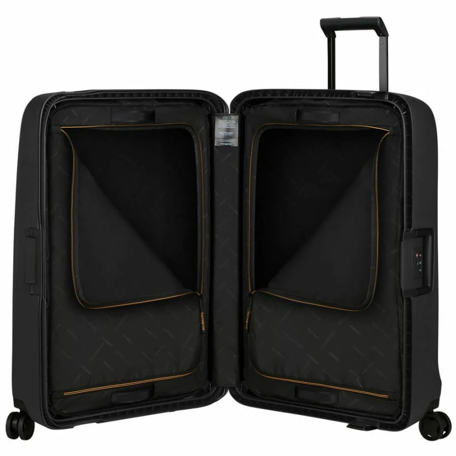 Der Samsonite Essens Trolley ist die perfekte Wahl für Reisende, die Wert auf Stil und Funktionalität legen. Dieser hochwertige Koffer ist mit den neuesten Technologien sowie Materialien ausgestattet und bietet eine robuste und langlebige Lösung für alle Reisebedürfnisse. Das Außenmaterial des Trolleys besteht aus einem leichten aber widerstandsfähigen Polypropylen (70 Prozent recycelt), das gegen Stöße und Kratzer geschützt ist. Das im Inneren verarbeitete Polyester wird aus recycelten PET-Flaschen hergestellt, ist also besonders nachhaltig. Die vier Doppellaufrollen garantieren einfaches Manövrieren, leises Rollen und Stabilität. Die ergonomischen Griffe sorgen für ein bequemes Tragen und das integrierte TSA-Schloss bietet zusätzlichen Schutz für Ihre wertvollen Gegenstände. Innen bietet der Samsonite Essens Trolley viel Stauraum für Ihre Reiseutensilien und zwei Packtaschen (Packfix – per Hand waschbar und mit Tragegriffen), welche herausgenommern werden können. Enthalten sind zudem Design-Sticker, mit welchem der eigene Koffer individualisiert werden kann.