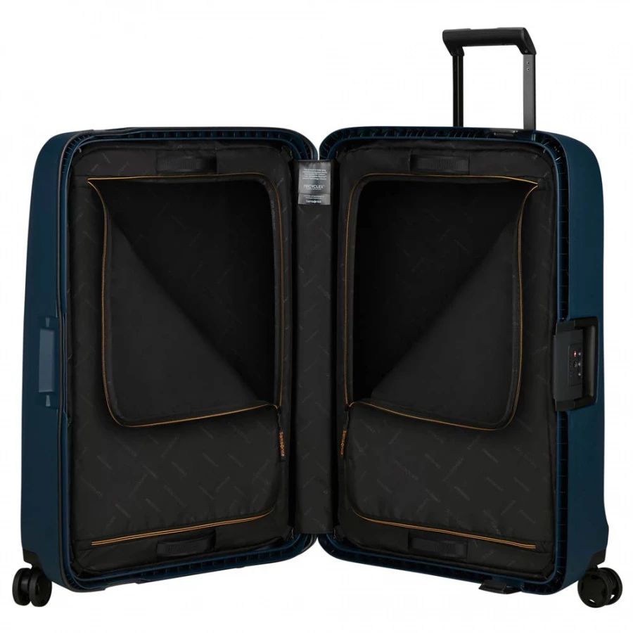 Der Samsonite Essens Trolley ist die perfekte Wahl für Reisende, die Wert auf Stil und Funktionalität legen. Dieser hochwertige Koffer ist mit den neuesten Technologien sowie Materialien ausgestattet und bietet eine robuste und langlebige Lösung für alle Reisebedürfnisse. Das Außenmaterial des Trolleys besteht aus einem leichten aber widerstandsfähigen Polypropylen (70 Prozent recycelt), das gegen Stöße und Kratzer geschützt ist. Das im Inneren verarbeitete Polyester wird aus recycelten PET-Flaschen hergestellt, ist also besonders nachhaltig. Die vier Doppellaufrollen garantieren einfaches Manövrieren, leises Rollen und Stabilität. Die ergonomischen Griffe sorgen für ein bequemes Tragen und das integrierte TSA-Schloss bietet zusätzlichen Schutz für Ihre wertvollen Gegenstände. Innen bietet der Samsonite Essens Trolley viel Stauraum für Ihre Reiseutensilien und zwei Packtaschen (Packfix – per Hand waschbar und mit Tragegriffen), welche herausgenommern werden können. Enthalten sind zudem Design-Sticker, mit welchem der eigene Koffer individualisiert werden kann.