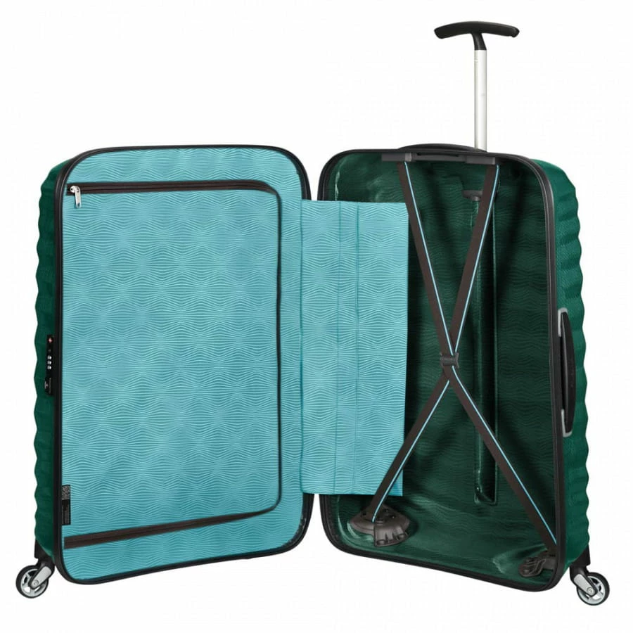 Der Samsonite Lite-Shock Trolley ist ein hochwertiger Hartschalenkoffer, der aus einer innovativen Schalenstruktur namens CURV® (eingetragenes Markenzeichen von CANCO Hungary Ltd) – gewebtes Polypropylen – gefertigt ist. CURV® ist ein besonders leichtes und robustes Material, das auch in der Raumfahrt eingesetzt wird. Dadurch ist der Koffer sehr widerstandsfähig gegen Stöße und Schläge, während er gleichzeitig ein geringes Eigengewicht aufweist. Zusätzlich ist der Samsonite Lite-Shock Trolley mit einem hochwertigen TSA-Zahlenschloss ausgestattet, welches den Inhalt des Koffers sicher vor unbefugtem Zugriff schützt. Im Inneren des Koffers gibt es das geräumige Hauptfach mit integrierten Packriemen, Raumteiler sowie einem separatem Reißverschlussfach, die eine geordnete Aufbewahrung von Kleidung und anderen Gegenständen ermöglichen. Die vier 360-Grad Doppelrollen ermöglichen eine einfache Handhabung und Manövrierfähigkeit auf allen Untergründen. Ein ausziehbarer Griff ermöglicht ein bequemes Ziehen des Koffers, während seitliche Tragegriffe eine einfache Handhabung beim Be- und Entladen gewährleisten.
