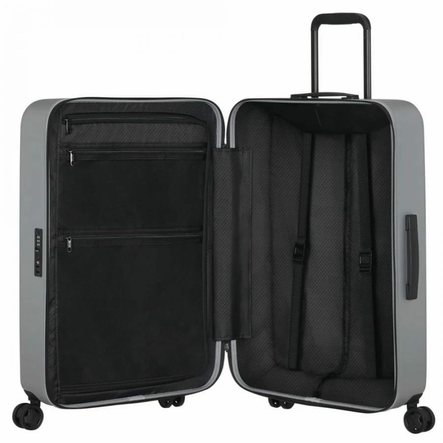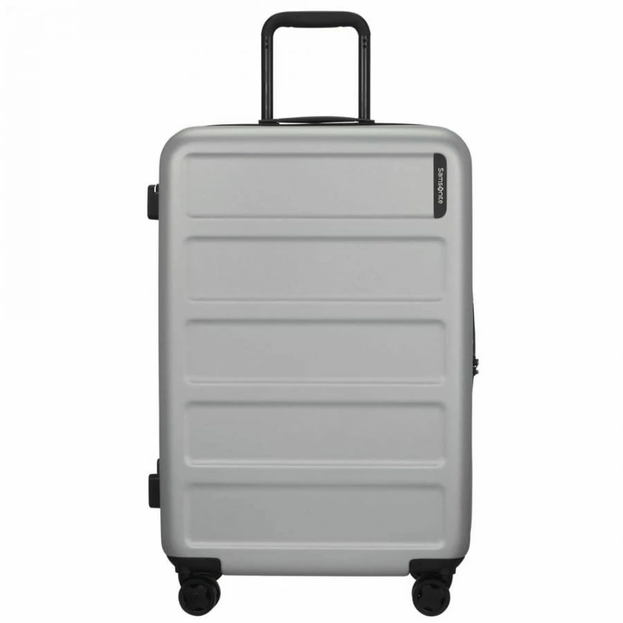 Der Samsonite Quadrix Trolley ist ein stabiler Hartschalenkoffer aus Polycarbonat, der aufgrund seines zeitlosen Designs gerne sowohl für Geschäftsreisen als auch für Urlaube genutzt wird. Für einen angenehmen Transport sorgen die vier 360-Grad Doppelrollen, Handgriffe und die mehrfach arretierbare Trolleystange. Geöffnet und verschlossen wird der Koffer mittels des doppelläufigen Reißverschlusses, welcher mit einem TSA-Zahlenschloss gesichert werden kann (dreistellige Kombination frei wählbar). Das große Hauptfach ist durch eine Reißverschluss-Trennwand zweigeteilt und verfügt über integrierte Packriemen, zwei RV-Innenfächer sowie ein aus PET-Flaschen recyceltes Innenfutter.