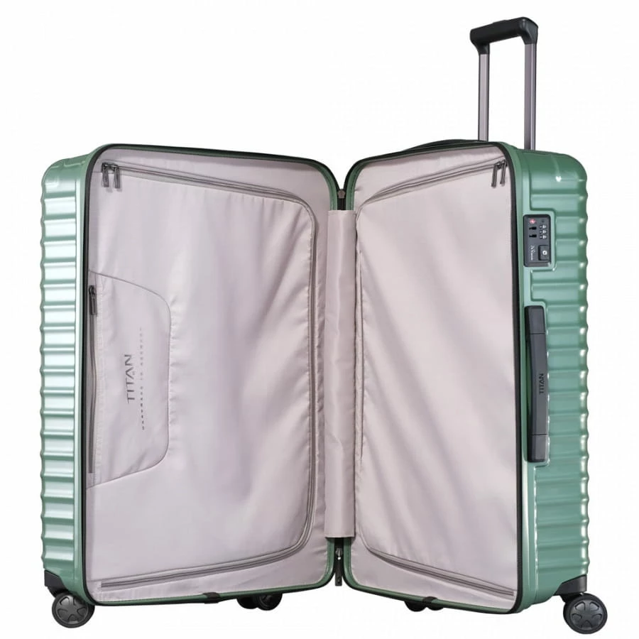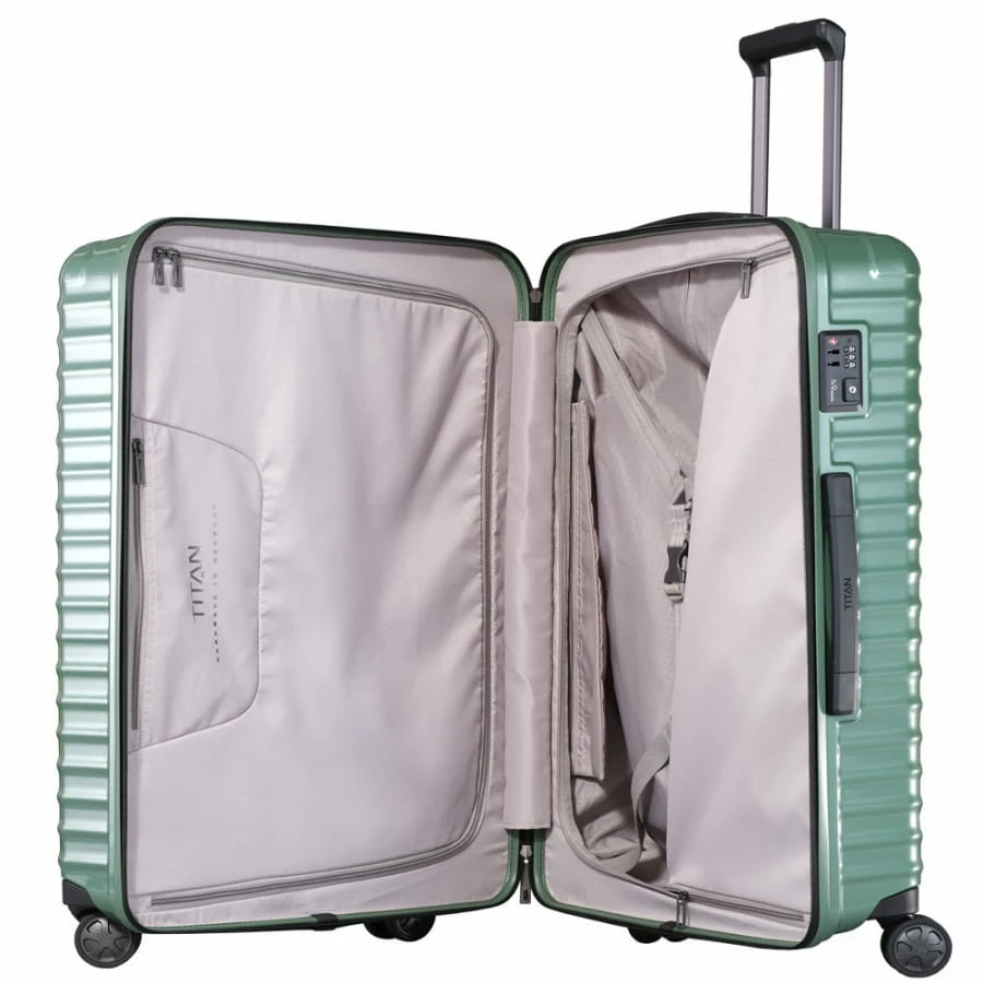 Der in Deutschland hergestellte Titan Litron Trolley L ist ein hochwertiger Trolley, welcher aus besonders widerstandsfähigem Polycarbonat gefertigt ist. Das Innenfutter besteht aus hochwertigem recyceltem Polyester. Durch das schicke und feine Design ist dieser Koffer ein richtiger Eye-Catcher. Über ein Fassungsvermögen von 100 Litern verfügt der Titan Litron Trolley L und bietet somit in Kombination mit zahlreichen Innenfächern endlose Verstaumöglichkeiten. Das integrierte Wäschefach und die Packriemen ermöglichen eine bessere interne Organisation. Mitgeführt lässt er der Koffer mithilfe der arretierbaren Trolleystange und der leichtläüfigen Zwillingsrollen. Die ergonomischen Tragegriffe sind für ein komfortables Tragen verantwortlich. Ein TSA-Schloss mit Zahlenkombination schützt das Reisegepäck vor unbefugtem Zugriff.