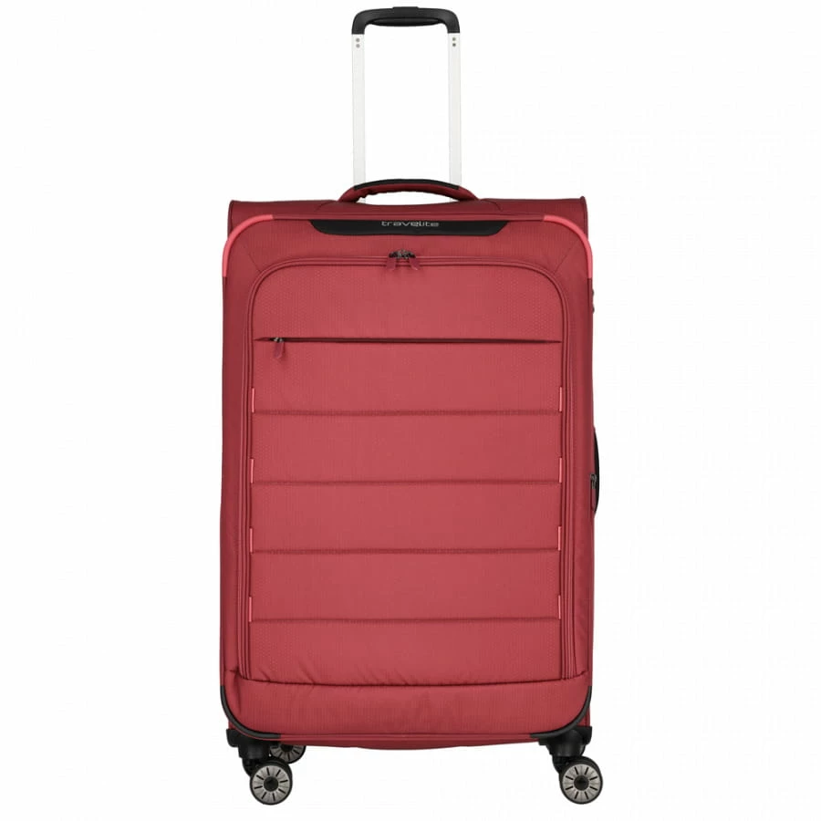 Mit einer Reißverschluss-Vortasche und seinem großen Hauptfach mit integrierten Packriemen, einem Reißverschlussfach, einer Mesh-Tasche sowie einem separatem Hemdenfach ist der optisch moderne Travelite Skaii Trolley für jede Reise gewappnet. Das im Korpus integrierte TSA-Zahlenschloss sorgt für Sicherheit, die Reißverschluss-Dehnfalte bei Bedarf für noch mehr Volumen. Transportiert wird der Travelite Skaii Trolley mithilfe der Handgriffe, der vier 360-Grad Doppelrollen und der mehrfach arretierbaren Trolleystange.