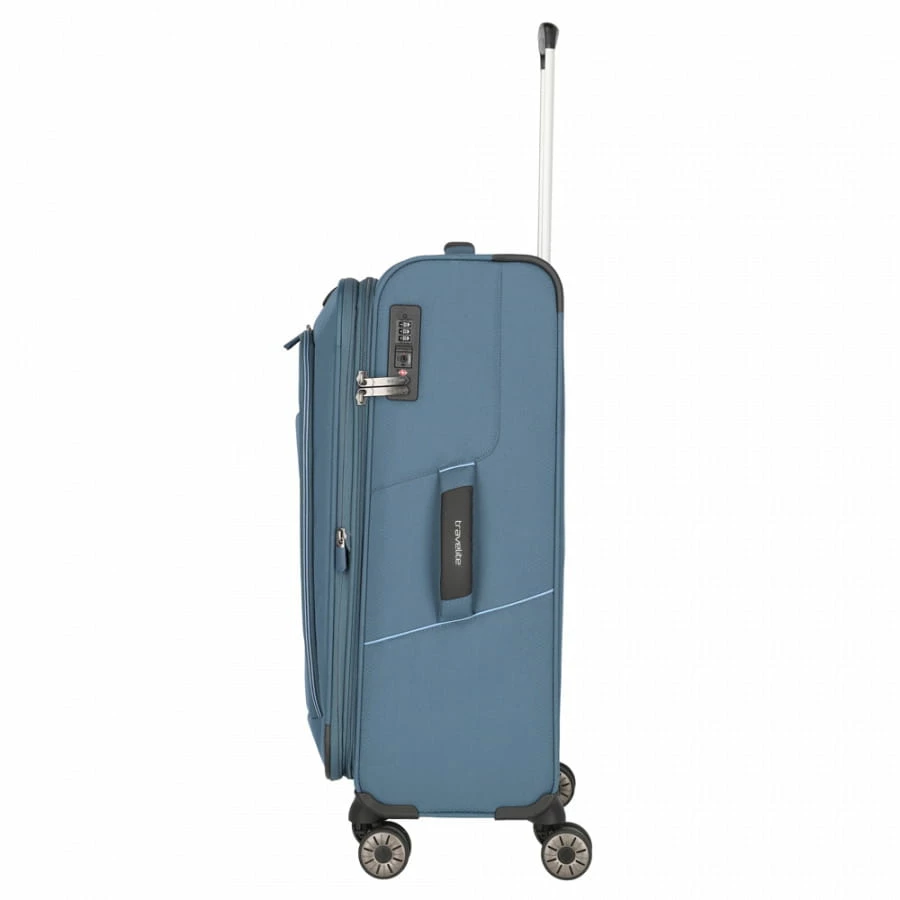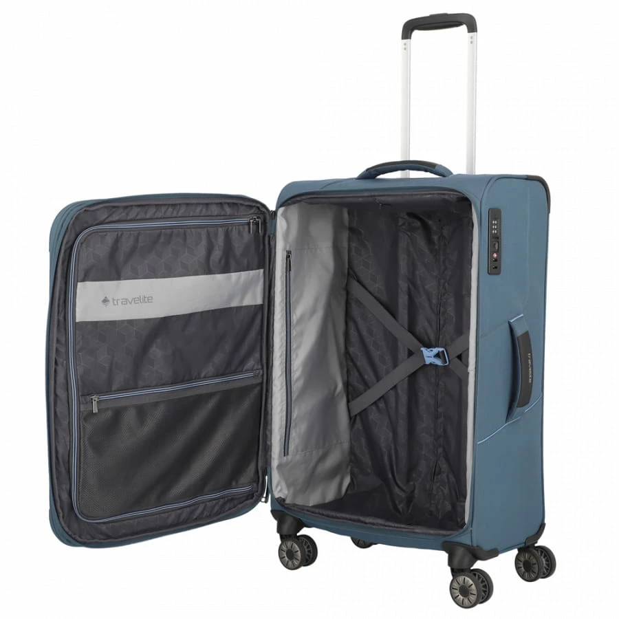 Mit einer Reißverschluss-Vortasche und seinem großen Hauptfach mit integrierten Packriemen, einem Reißverschlussfach, einer Mesh-Tasche sowie einem separatem Hemdenfach ist der optisch moderne Travelite Skaii Trolley für jede Reise gewappnet. Das im Korpus integrierte TSA-Zahlenschloss sorgt für Sicherheit, die Reißverschluss-Dehnfalte bei Bedarf für noch mehr Volumen. Transportiert wird der Travelite Skaii Trolley mithilfe der Handgriffe, der vier 360-Grad Doppelrollen und der mehrfach arretierbaren Trolleystange.